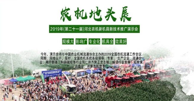 2019年河北農(nóng)機(jī)新機(jī)具新技術(shù)推廣演示會(huì)將于本月25日在河北省石家莊市正定縣南樓鄉(xiāng)召開!“規(guī)模大、機(jī)具全、專業(yè)化、影響廣、效果好等優(yōu)點(diǎn)使得河北農(nóng)機(jī)新機(jī)具新技術(shù)推廣演示會(huì)成為了農(nóng)機(jī)企業(yè)進(jìn)行產(chǎn)品推廣的有效平臺(tái),同時(shí)也為廣大農(nóng)民朋友提供一個(gè)現(xiàn)場(chǎng)觀摩機(jī)具作業(yè)的機(jī)會(huì),切實(shí)提高購(gòu)機(jī)的真實(shí)性和可靠性!
